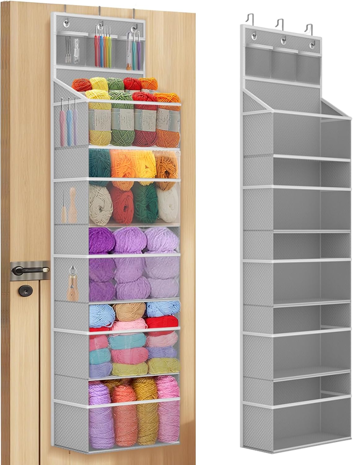 Visualization Window: This over the door yarn organizer designed with mesh window pockets, you can clearly see the yarn balls on each layerand find it quickly without opening every compartment. Manage your crochet yarn kit easily and enjoy a clutter-free space